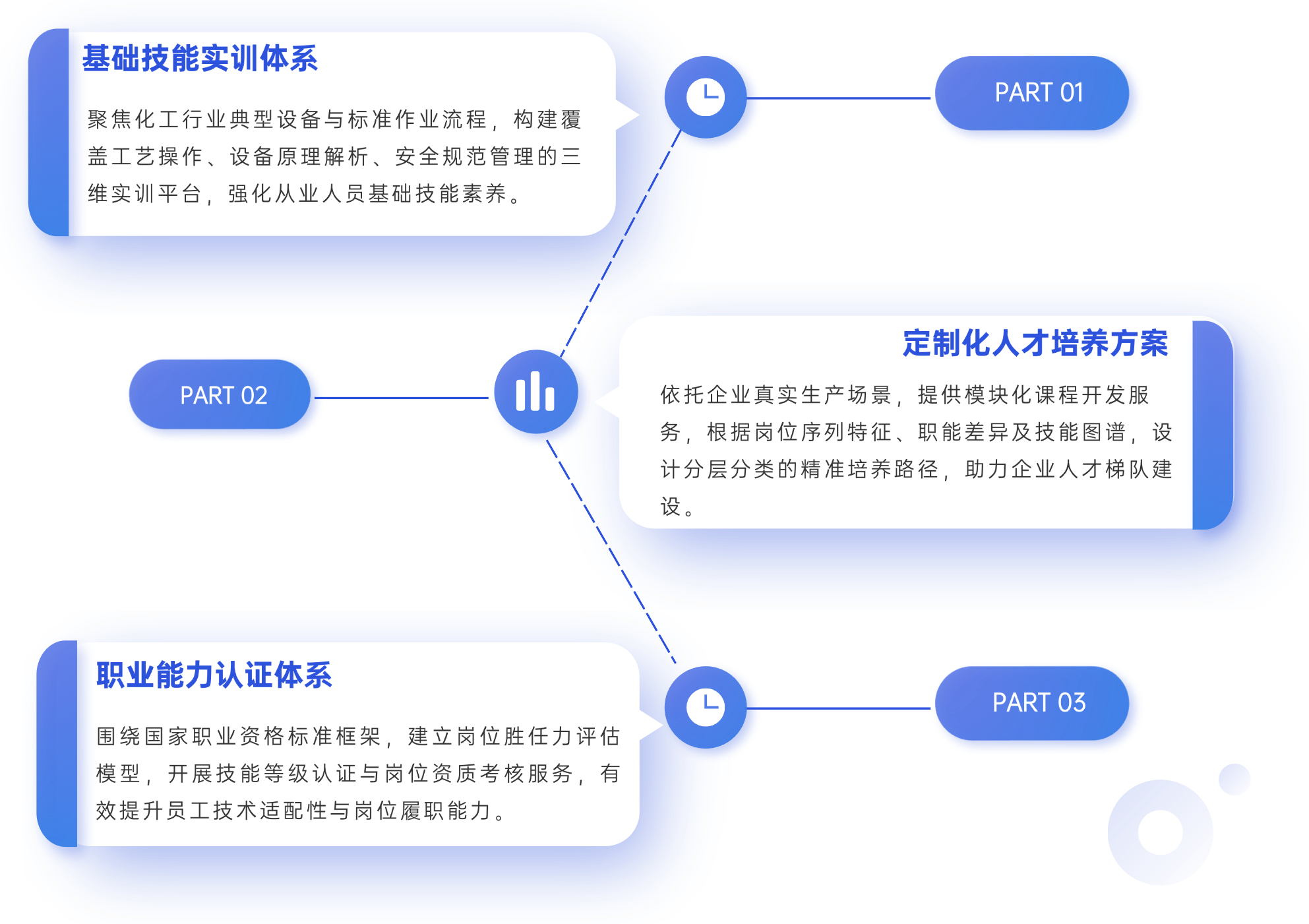 建设内容包括:课程大纲、控课表、培训矩阵、教师讲义、学员手册、课程PPT、考培题库、动画素材仿真资源、教师线上培训视频、工厂实景培训视频、设备实操培训视频。与行业专家合作录制的专业视频、AI数字人讲解、操作现场实景拍摄、生动形象的动画素材等多种形式。