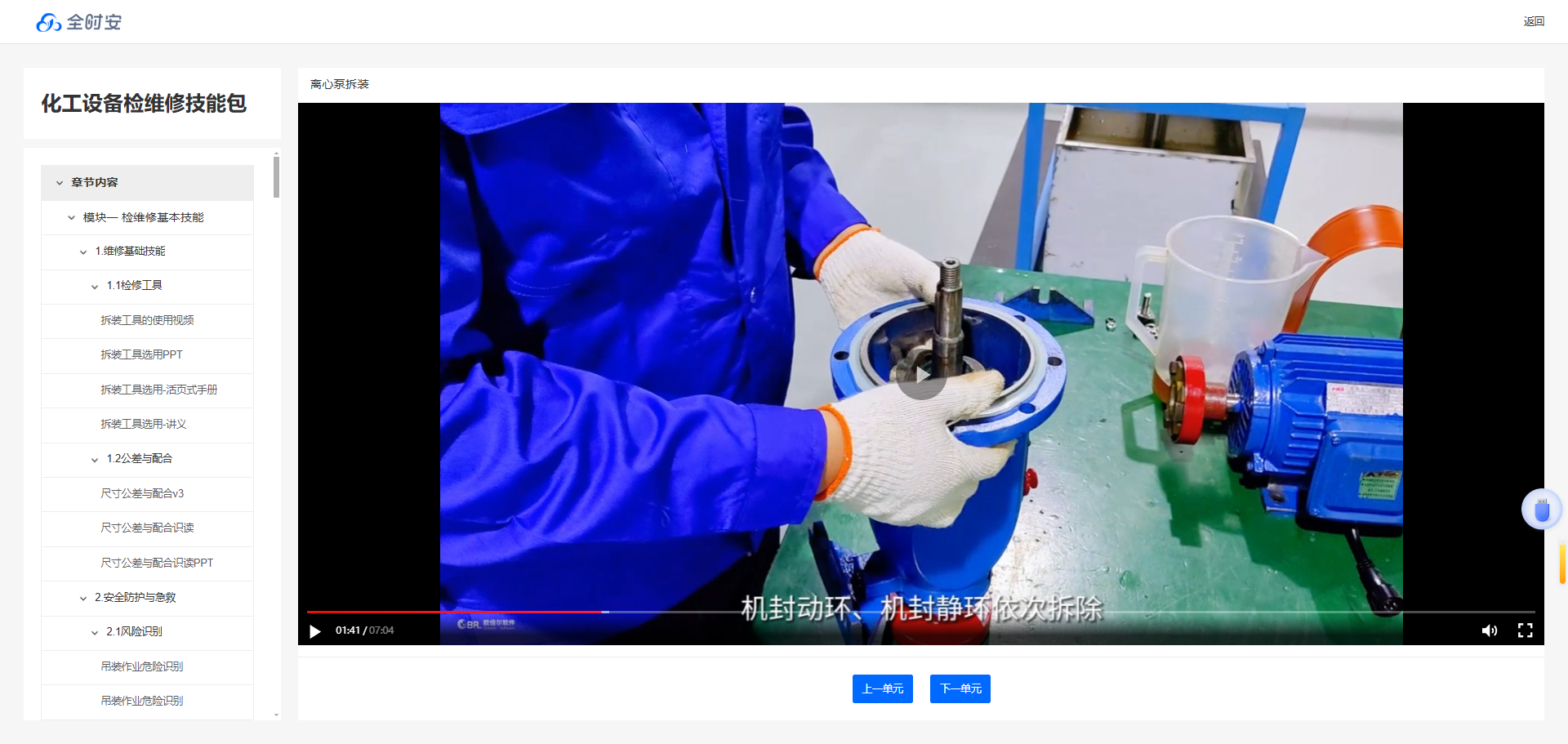 设备检维修相关培训课程以设备维修人员、设备操作及管理人员为培训对象,细化岗位必备的知识技能要求,培训资源类型均包含PPT、教师讲义、学员手册、讲解视频等,讲解视频的形式根据培训内容的侧重点不同分为理论讲解视频和实操讲解视频。理论讲解视频以真人理论知识讲解、动画特效展示、装置实景展示等形式进行讲解,实操讲解视频以真人操作实际设备的形式进行讲解。
