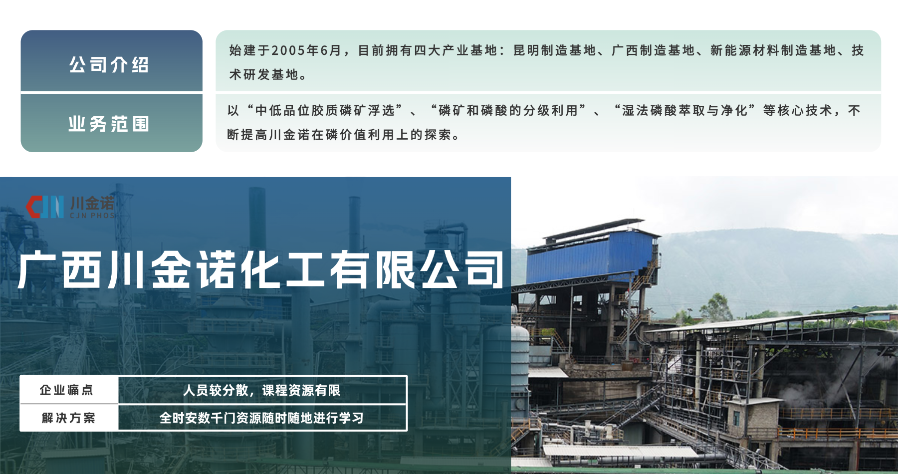 广西川金诺化工有限公司![]() 公司简介: 作为西南地区磷化工转型升级的标杆企业,广西川金诺化工有限公司正通过 "传统化工提质增效 + 新能源材料战略突围" 的双轨模式,逐步从区域性企业向全国性化工集团迈进。其发展路径为传统化工企业的绿色化、高端化转型提供了可借鉴的范本。 全时安虚拟仿真平台: 1、企业痛点: 人员较分散,无法形成统一管理;课程资源有限,无法形成完整的课程体系。 2、解决方案: 全时安可实现pc端+小程序端,学员随时随地可进行学习; 平台有数千门课程资源,可免费提供给企业进行使用。 ![]() |