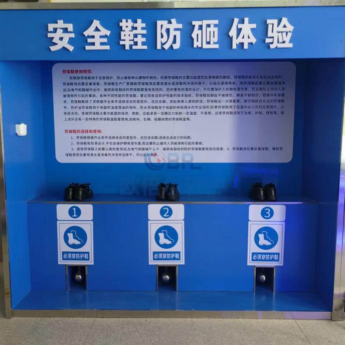 安全鞋防砸体验系统 安全鞋撞击体验设置为三人用配备遥控装置,尺寸可根据现场实际尺寸调节。体验时正确穿戴安全鞋后直立在指定位置,开启遥控,安全球通过坠落砸击安全鞋鞋头部位,使学员切实感受安全鞋对于作业人员受到除坠落物、硬质物体的冲击及挤压时,减少冲击力,消除或减轻其对人体足部的伤害的重要作用,感受在搬运重物时安全鞋起到的安全保护作用,加深对穿戴安全鞋的重要性。