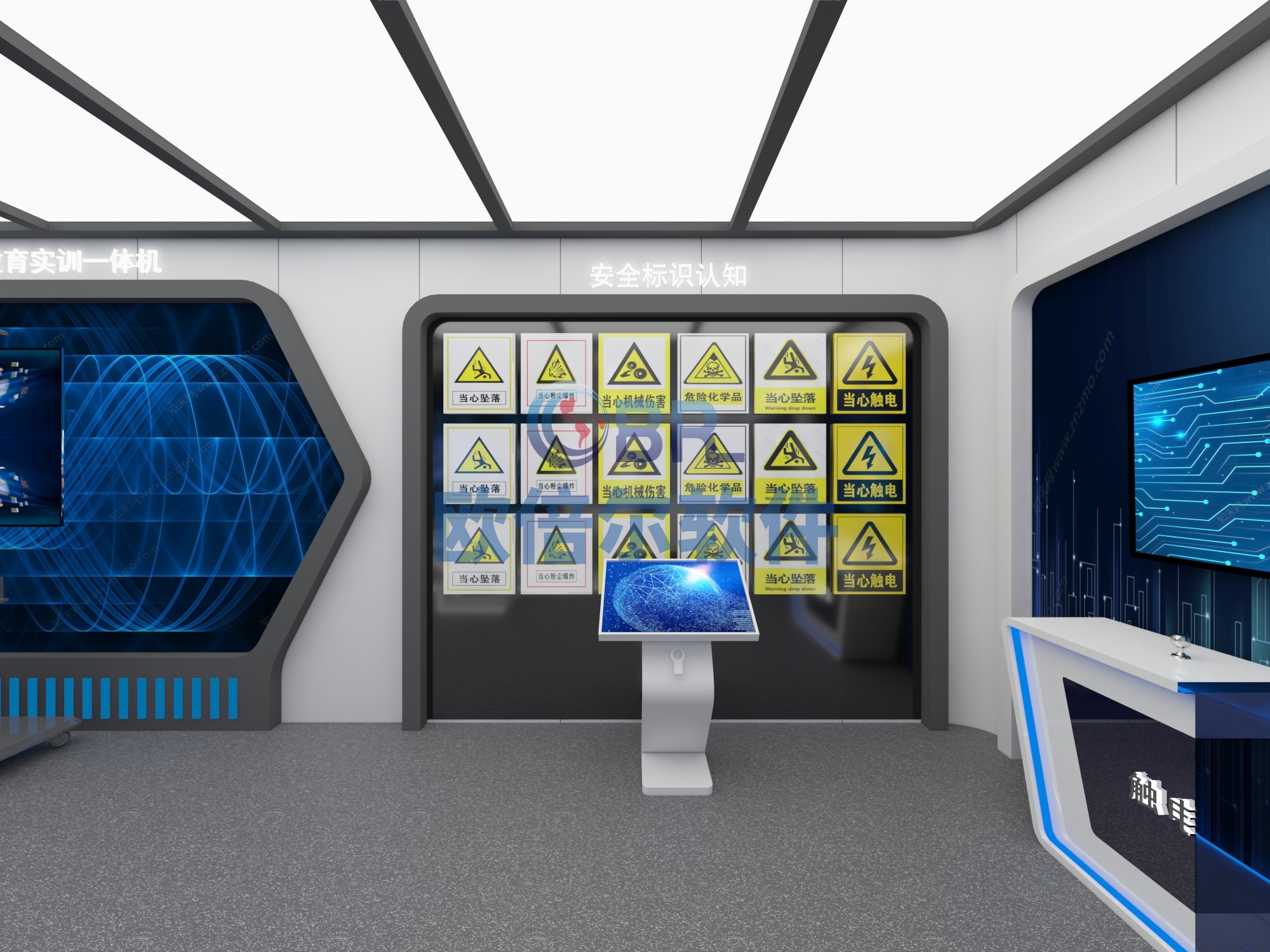 安全标识认知系统 安全标识认知系统主要用于安全标识的教学和认知,包括:禁止标识、指令标识、警告标识、提示标识。系统包含知识拓展、安全标识竞答两个板块,涵盖50多个安全标识,通过触摸屏控制并点亮墙面对应标识灯箱,并语音同步进行标识介绍播报。帮助员工正确的理解标志的含义与重要性,培养用户爱护安全标志,平时依照标志操作,遇到危险参照标志行动的习惯。