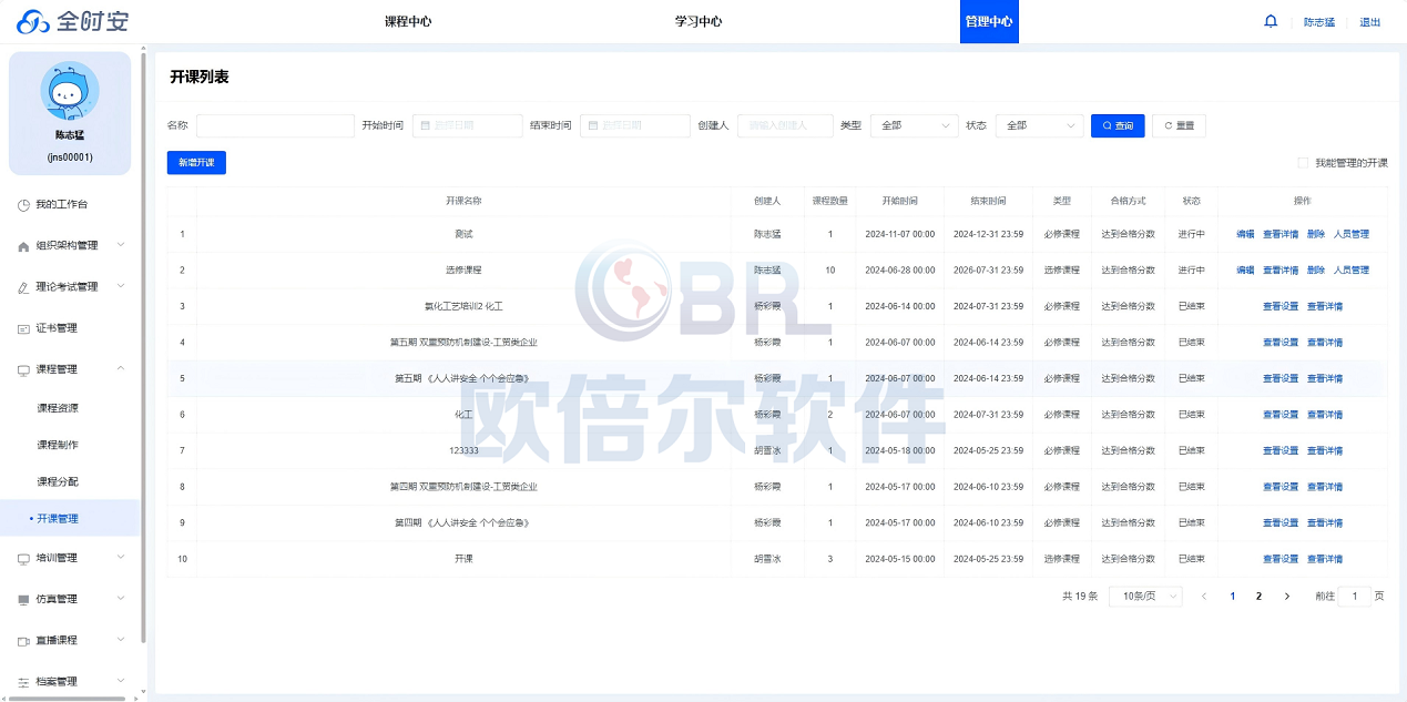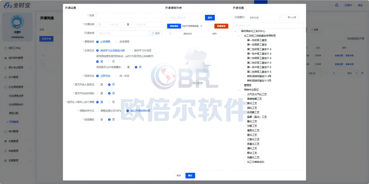 可根据不同的开课计划,选择资源创建、编辑课程,可将课程进行开课:输入开课名称、选择开课开始和结束日期,合格方式、成绩发放方式、开课完成后可在开课列表查看开课设置页面以及开课详情,学习记录可导出。