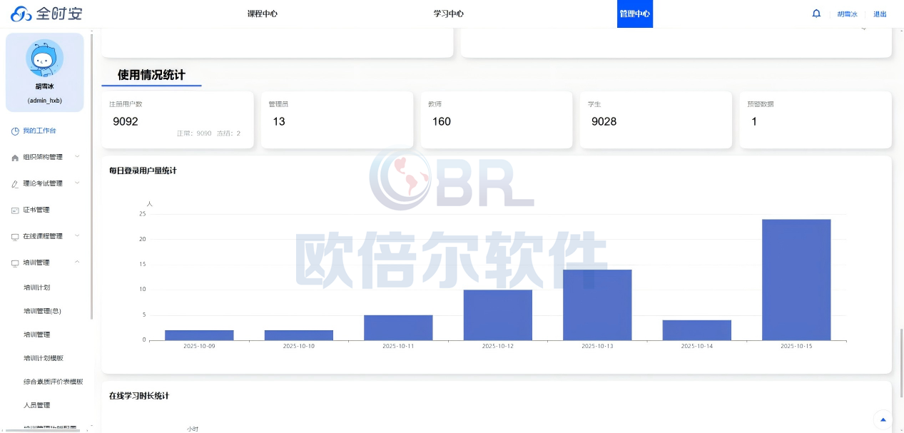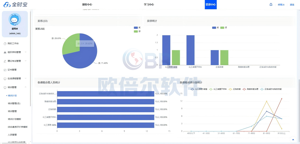 包含培训数据统计、课程数据统计、考试数据统计、使用情况统计等功能,便于统计及分析培训、课程、考试、使用情况。