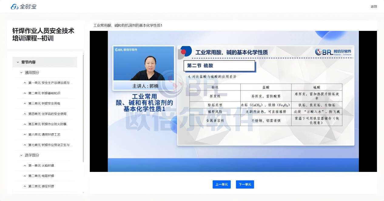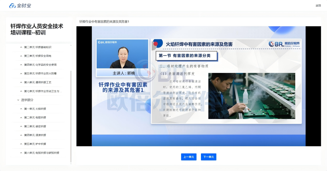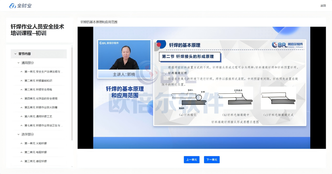 为满足钎焊培训的合规性要求,北京欧倍尔推出了钎焊作业人员安全技术培训课程,该课程严格依据国家安全生产监督管理总局发布的《钎焊作业人员安全技术培训大纲和考核标准》进行开发。北京欧倍尔钎焊作业人员安全技术培训课程采用模块化设计,分为“通用部分”(56学时)与“选学部分”(48学时)。本课程平台功能灵活,既可由考试机构组织学员完成学时要求,也可供学校、企业直接用于组建定制化的培训项目。